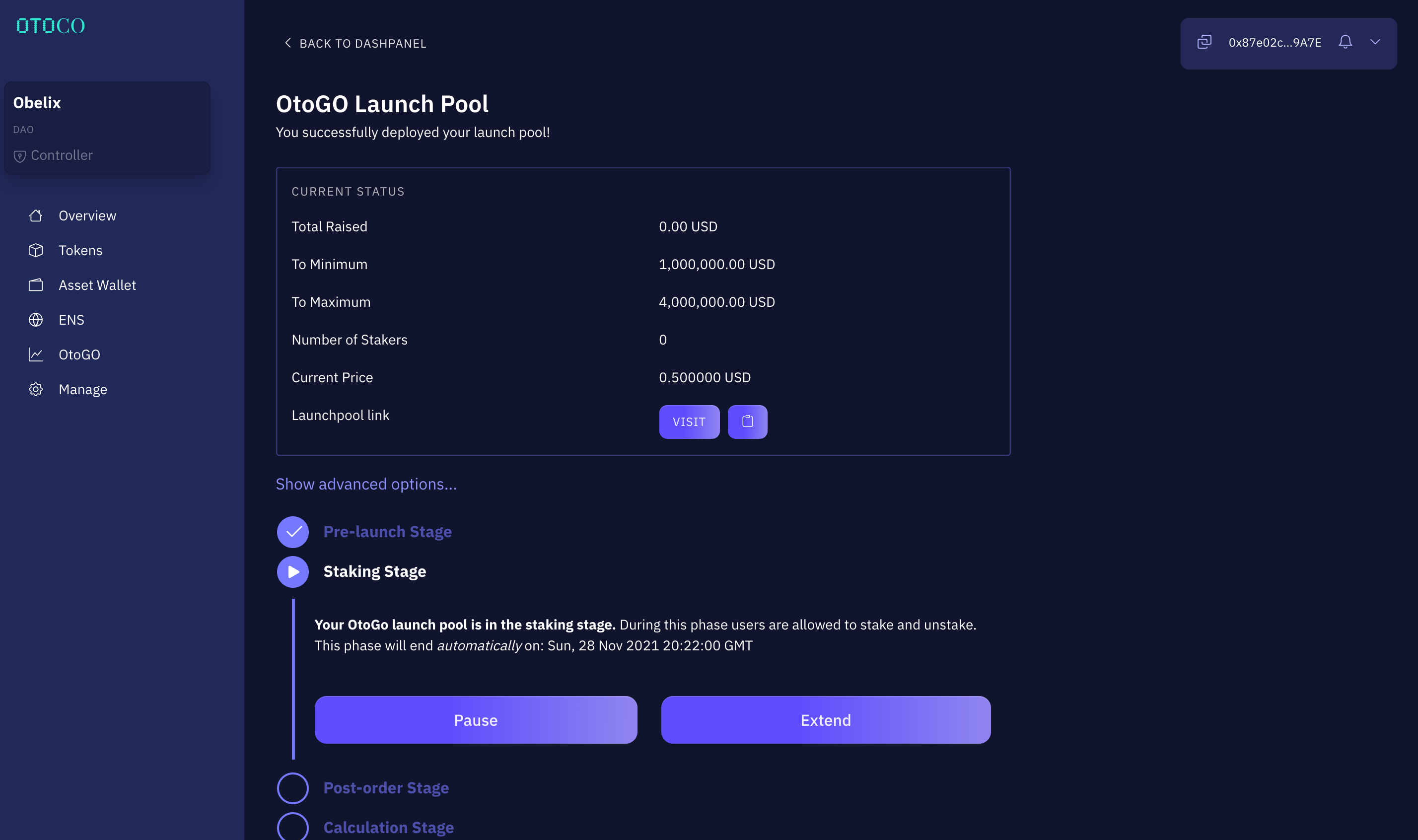Once the above transaction confirms, you will be able to manage your launchpool’s lifecycle.