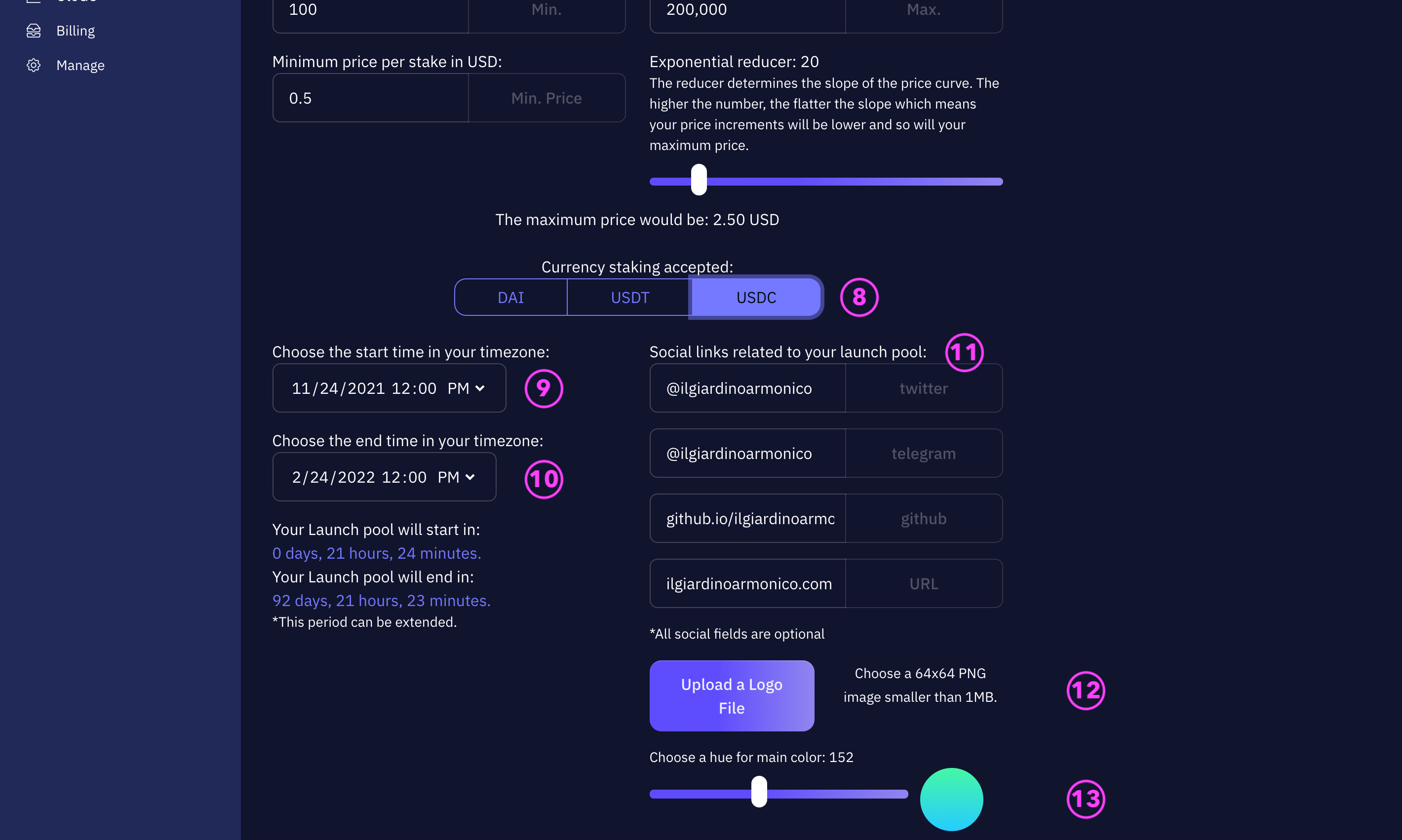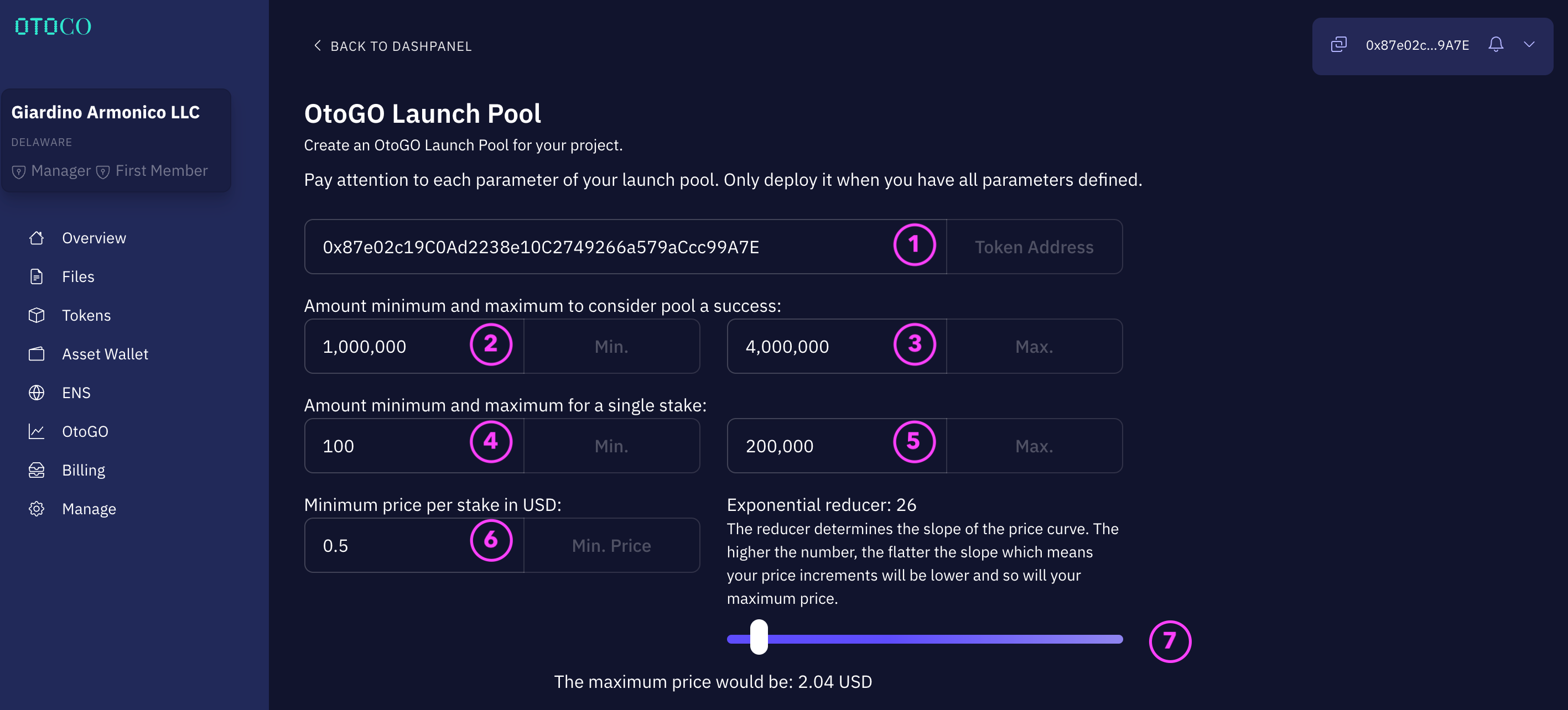 In the example above, with the minimum price per token set at USD 0.5 and the reducer set to 26, the price will gradually increase along a sloping curve to a maximum of USD 2.04 per token as the pool fills.