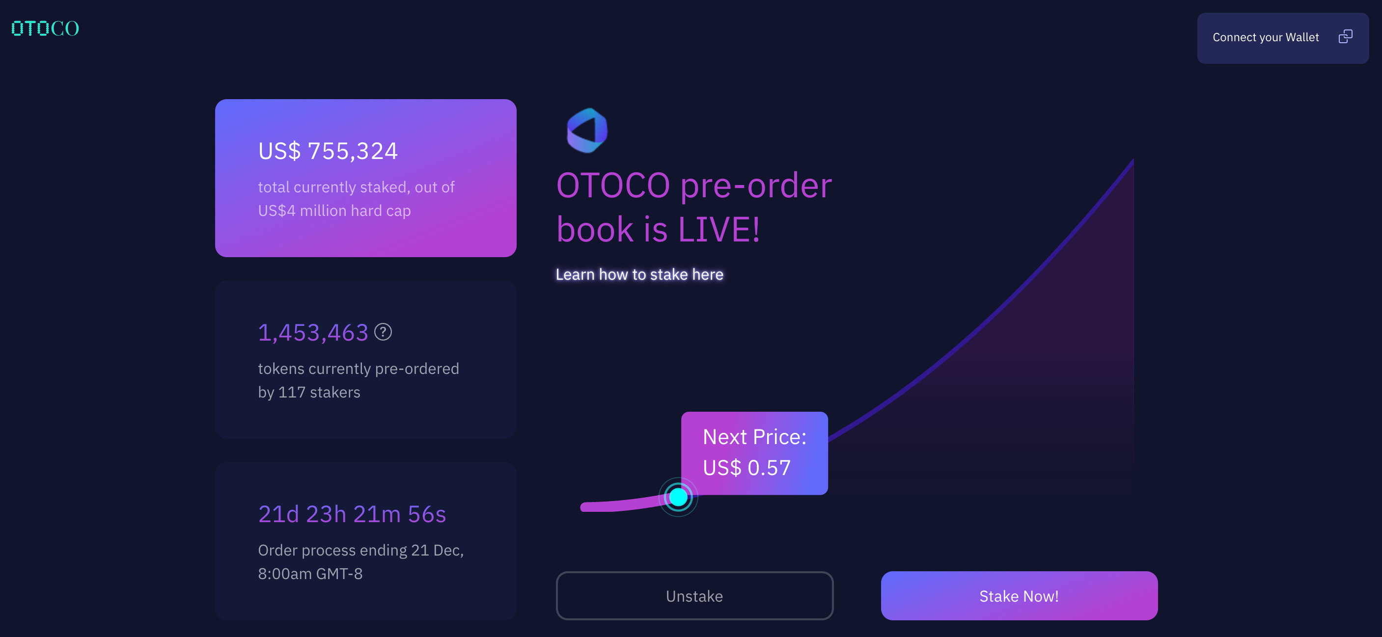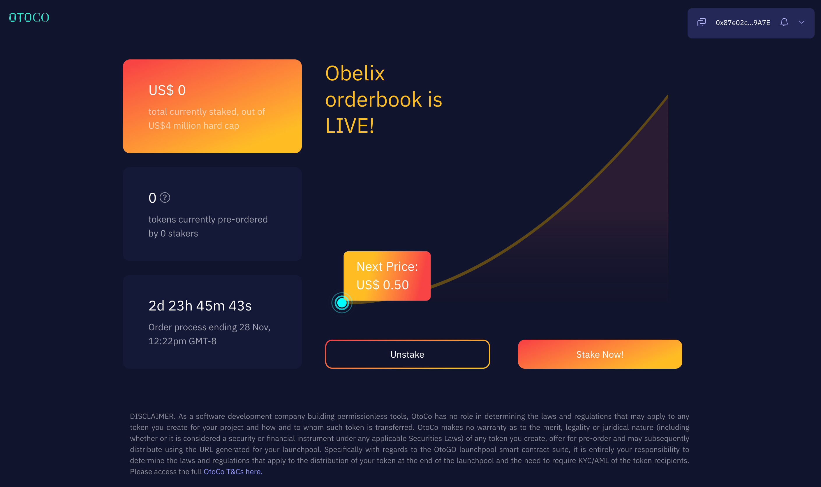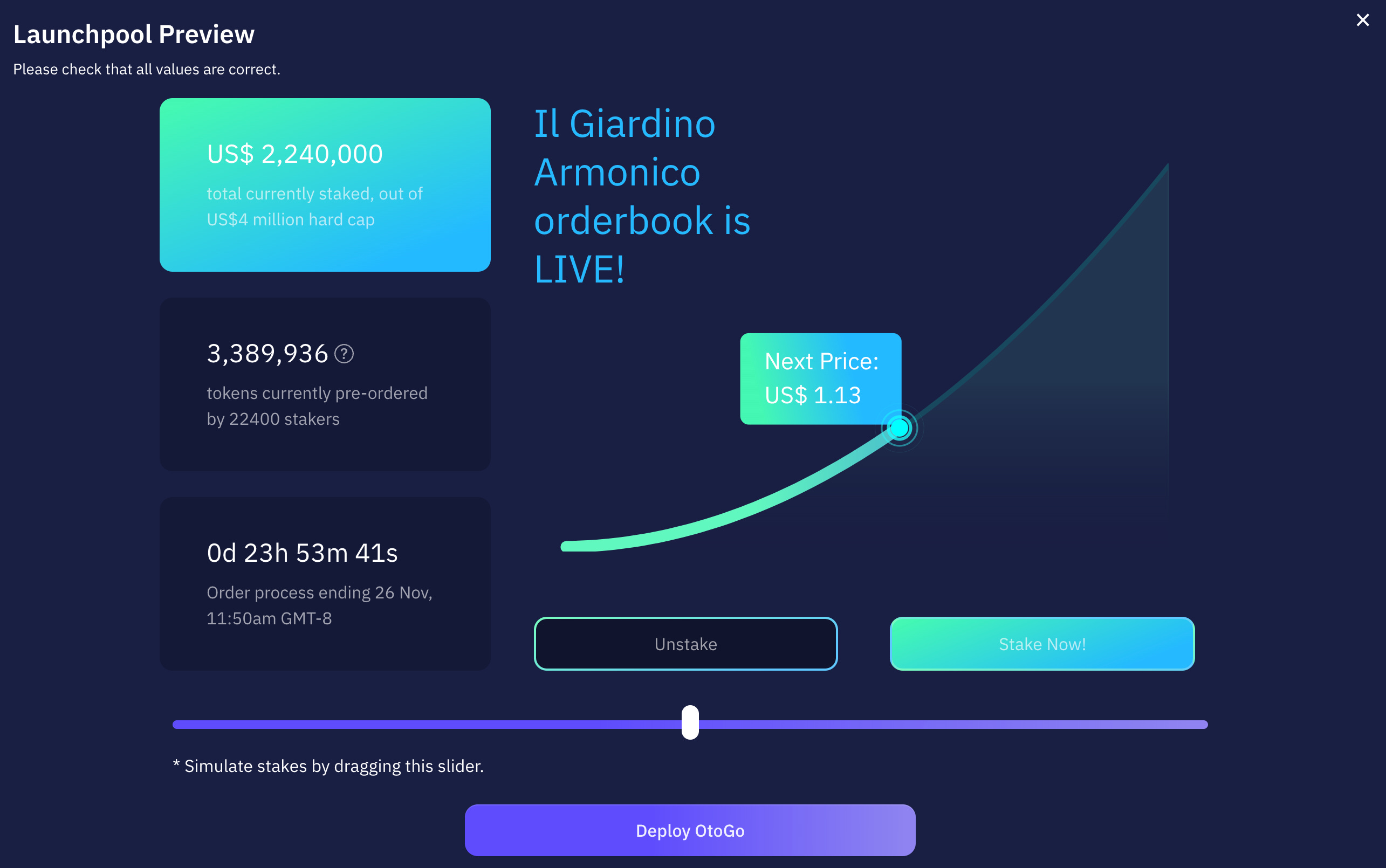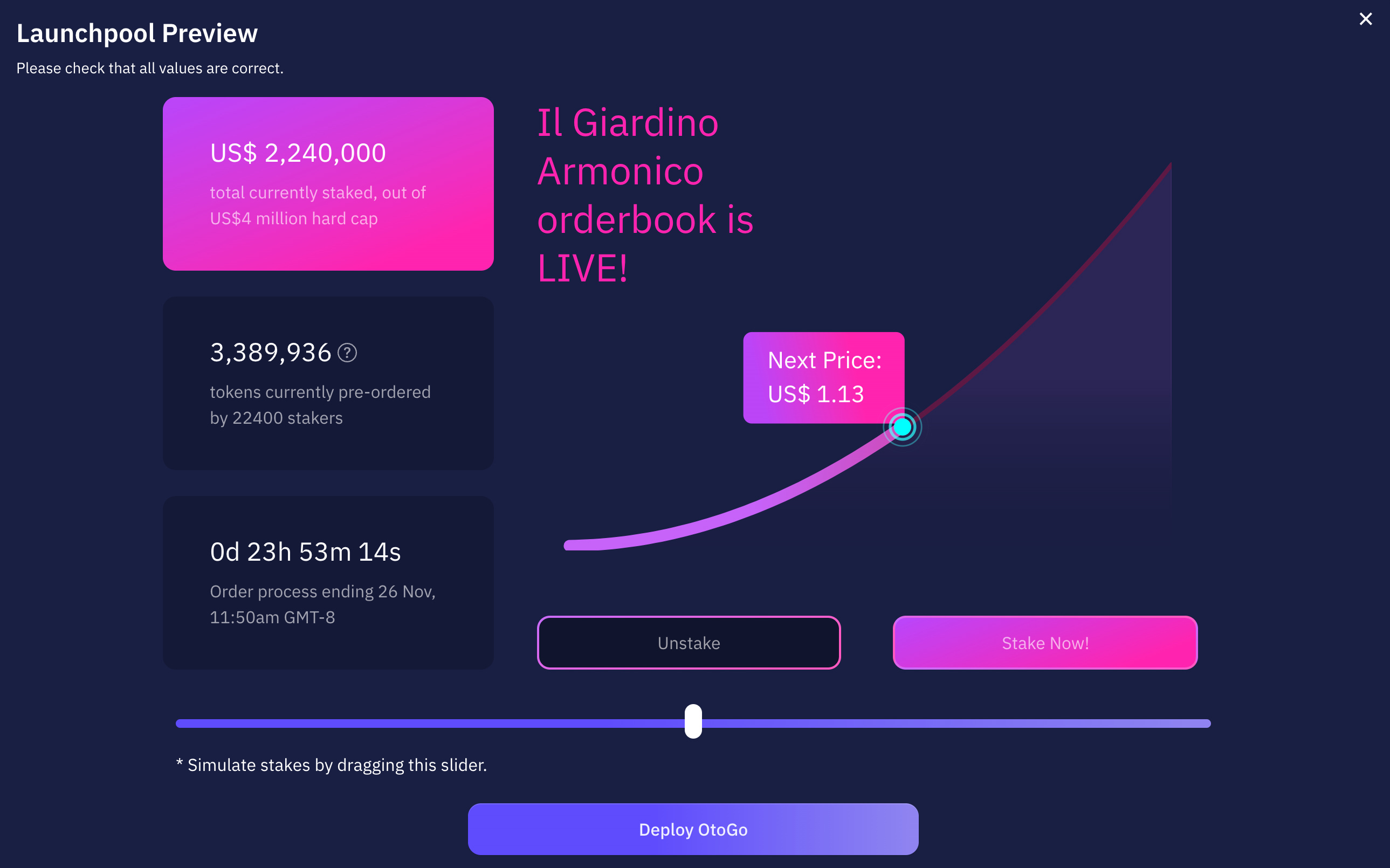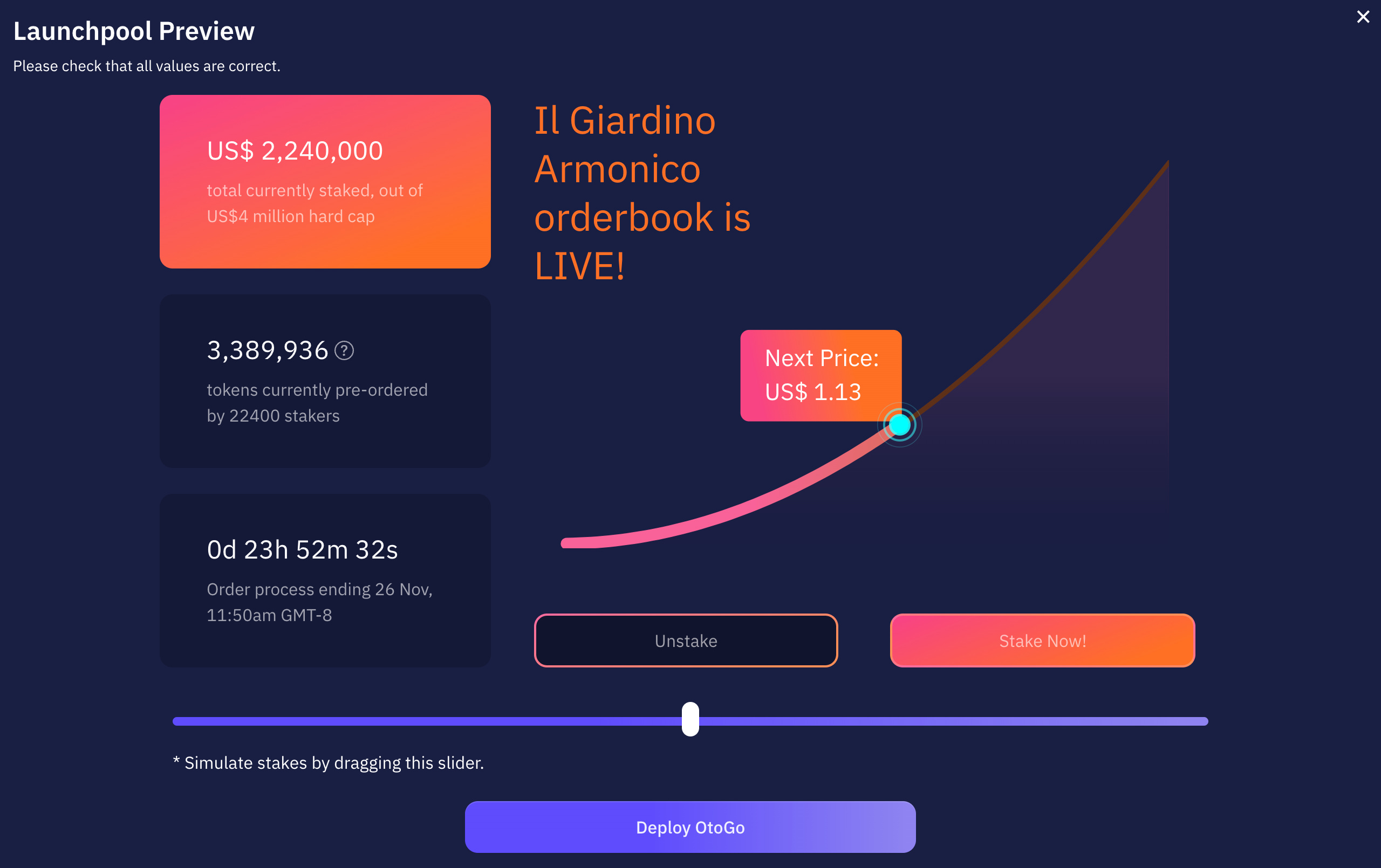 With this in mind, we started building a suite of launchpool smart contracts we reported on earlier, and over the last weeks, we used this to let our community pre-order our OTOCO token, using an algorithmic price-setting under a bonding curve, visible and accessible to all who want to stake the project with up to US$200,000 per staker.