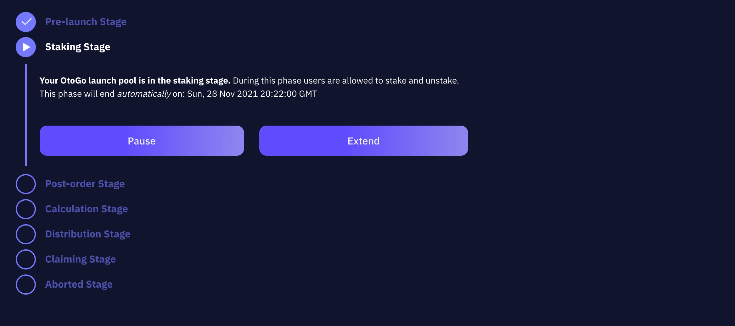 pauseandunpauseyour Staking Stage at any time. Nobody can stake when your launchpool is paused but people can still unstake. If the hardcap is not reached, the project sponsor can choose toextendthe launchpool by a chosen number of days. Staking and unstaking then continues during the extension. Note that theextendfunction has to be called before the end date.Post-order Stage