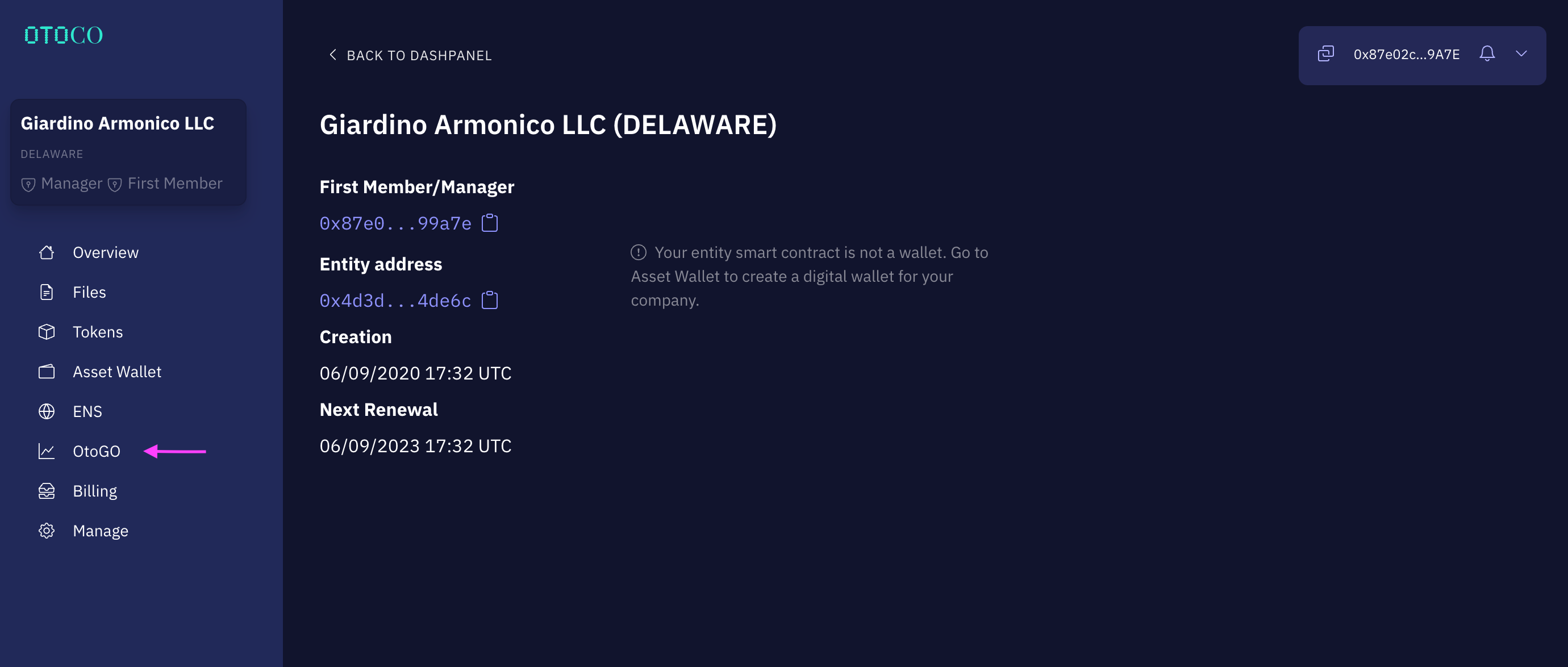 First, connect your Ethereum wallet you used to spin up an entity with OtoCo and simply go to your organization dash. Select OtoGO from the menu to the left.