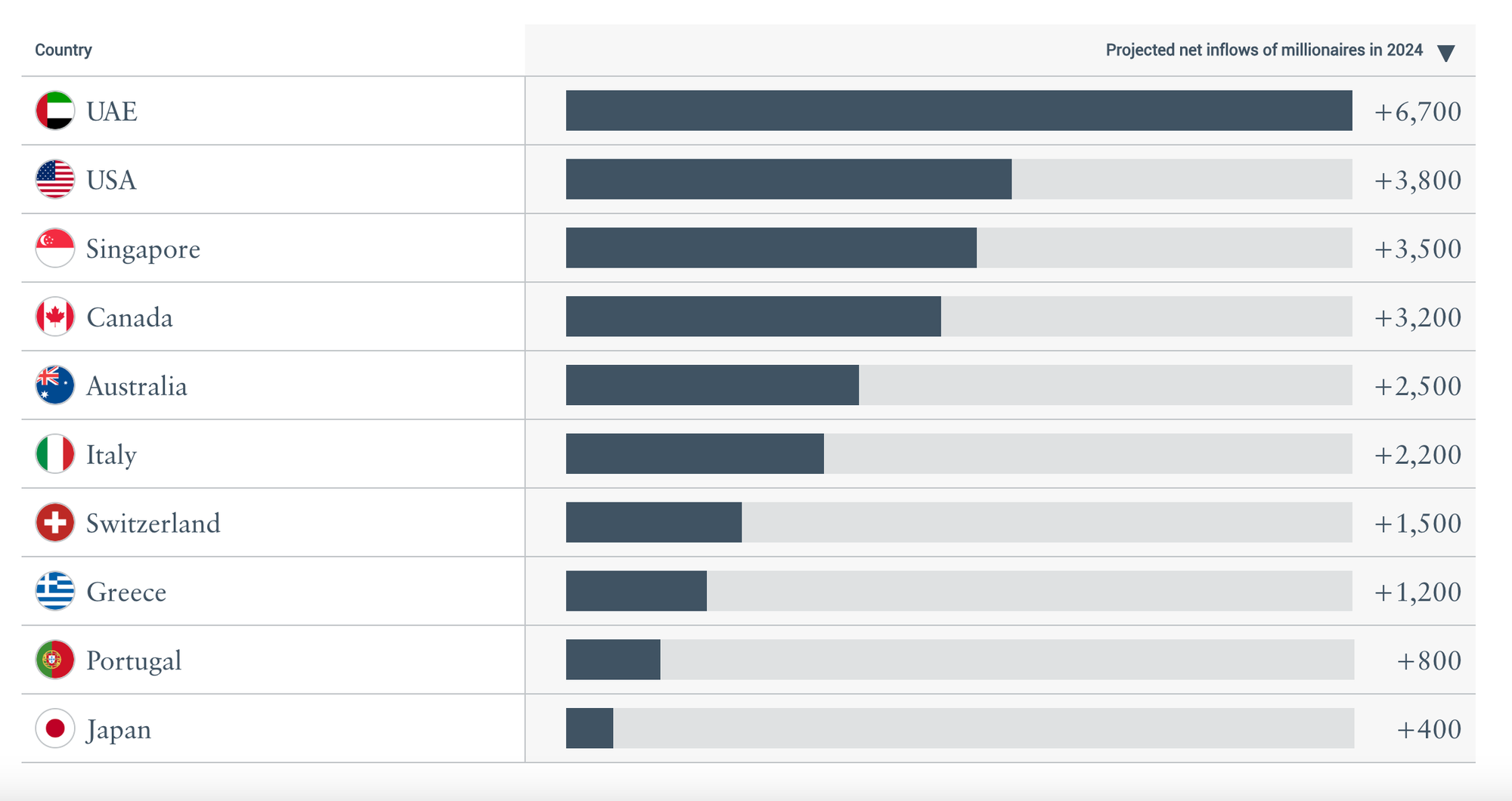 The United Arab Emirates is their top destination, followed by the U.S. The former is now home to 81,200 millionaires, including 237 centimillionaires and 20 billionaires, a 102% increase in the last decade.