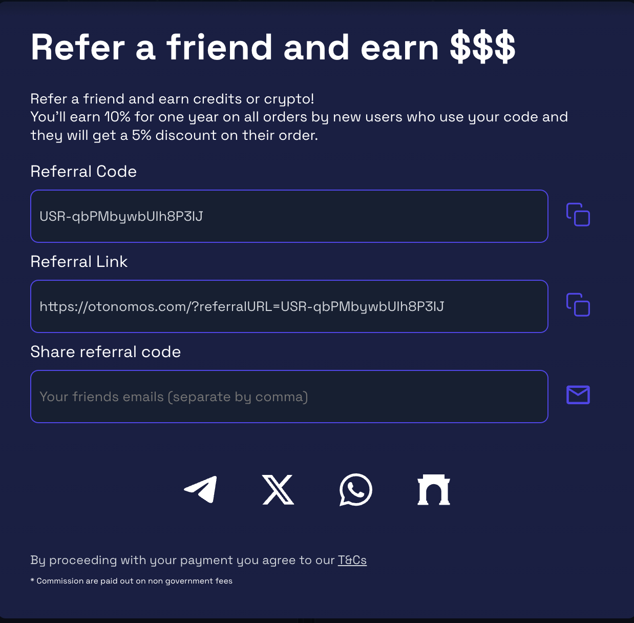 - When friends or contacts you refer to Otonomos use your code, we will automatically tabulate any new orders they place within one year and send you 10% on the total amount (ex Government fees) they spend with us.